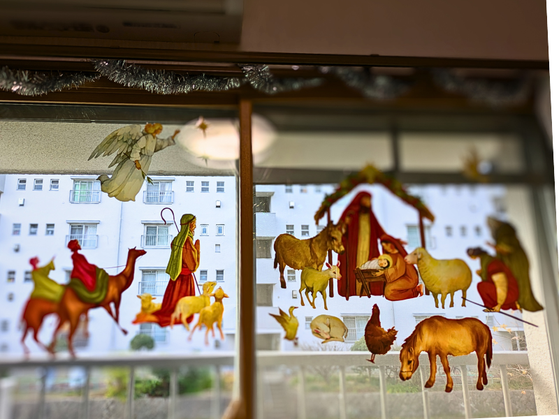 窓辺には、救い主イエス・キリストが誕生した最初のクリスマスの情景を飾りました。飼い葉桶のキリスト、ヨセフとマリヤ、羊を守る羊飼いたちが拝みに訪れ、天使が見守り、そして遠い国から星に導かれてやってきた東方の博士たち。