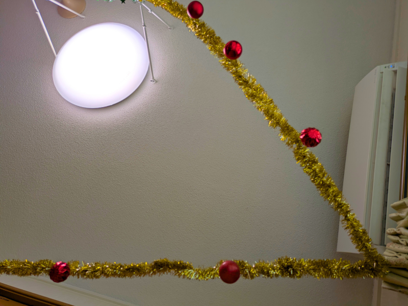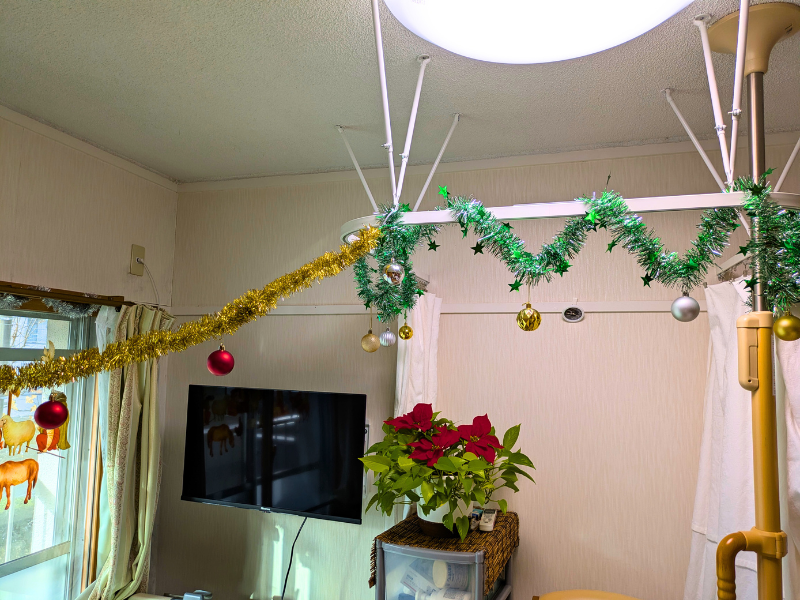 父は横になって過ごす時間が多く、長いあいだ天井を見つめています。その視線に少しでも光が届きますようにと、見上げた天井にも金色のガーランドをそっと飾りました。ゆっくり揺れる赤いオーナメントが、静かな時間を柔らかく照らしてくれます。