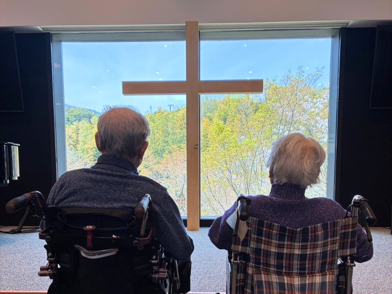 父は新しくできた教会をひと目見たいと、ずっと心待ちにしていました。最近は眠っている時間が増えてきた父の体調を思うと迷いもありましたが、その日は思いきって出かけました。礼拝堂でその歌声に包まれながら、父は涙を流していました。その姿は、父のたましいの美しい輝きとして、私の心に深く刻まれました。私たちにとっても、その時間は神さまからの大切な贈りもののように思えました。